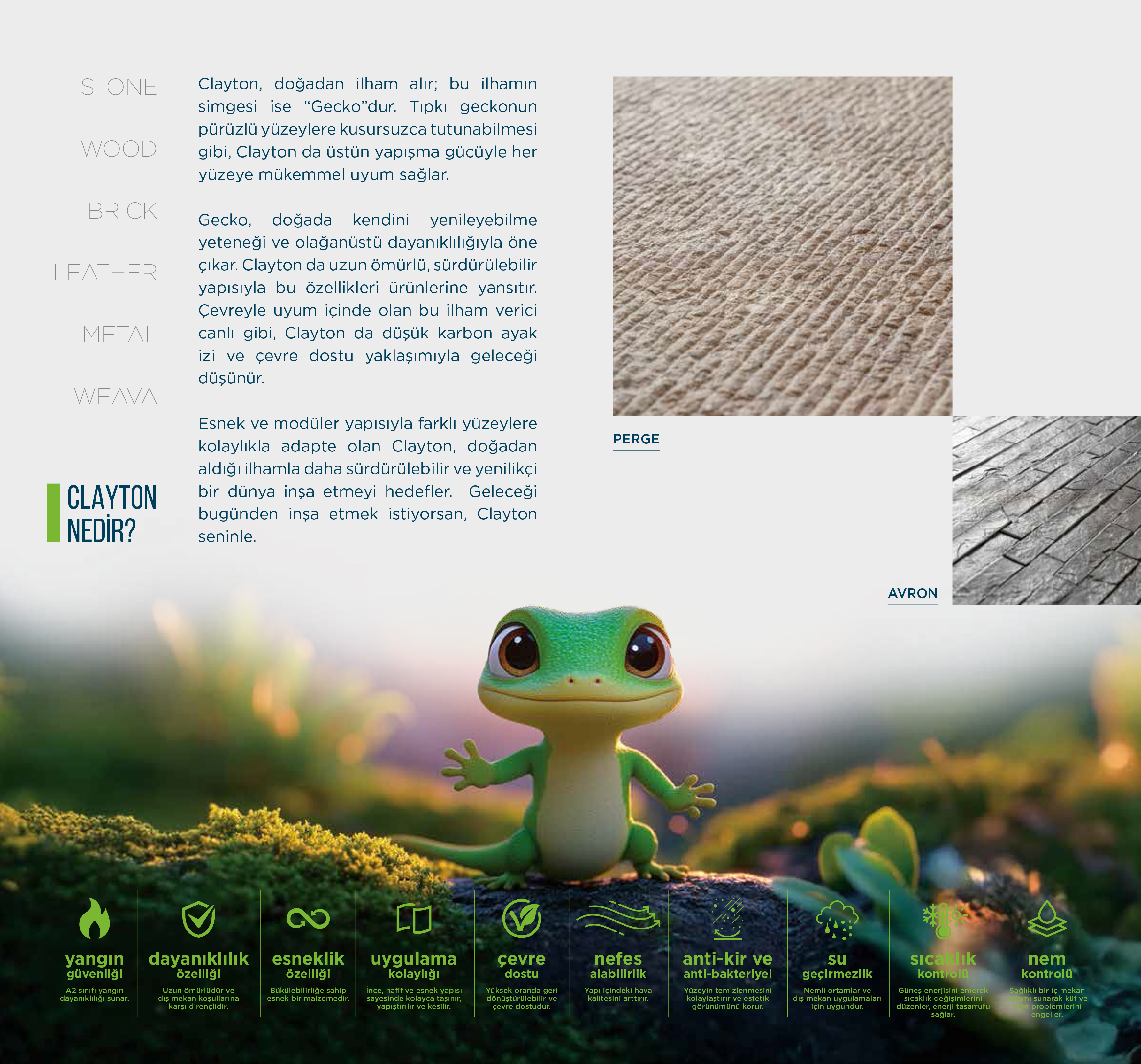 Parke koleksiyonlarımız, iç mekanlara sıcaklık ve zarafet katar; Clayton yüzey kaplamalarımız ise inovatif teknoloji ve doğadan ilham alan tasarımı birleştirir.